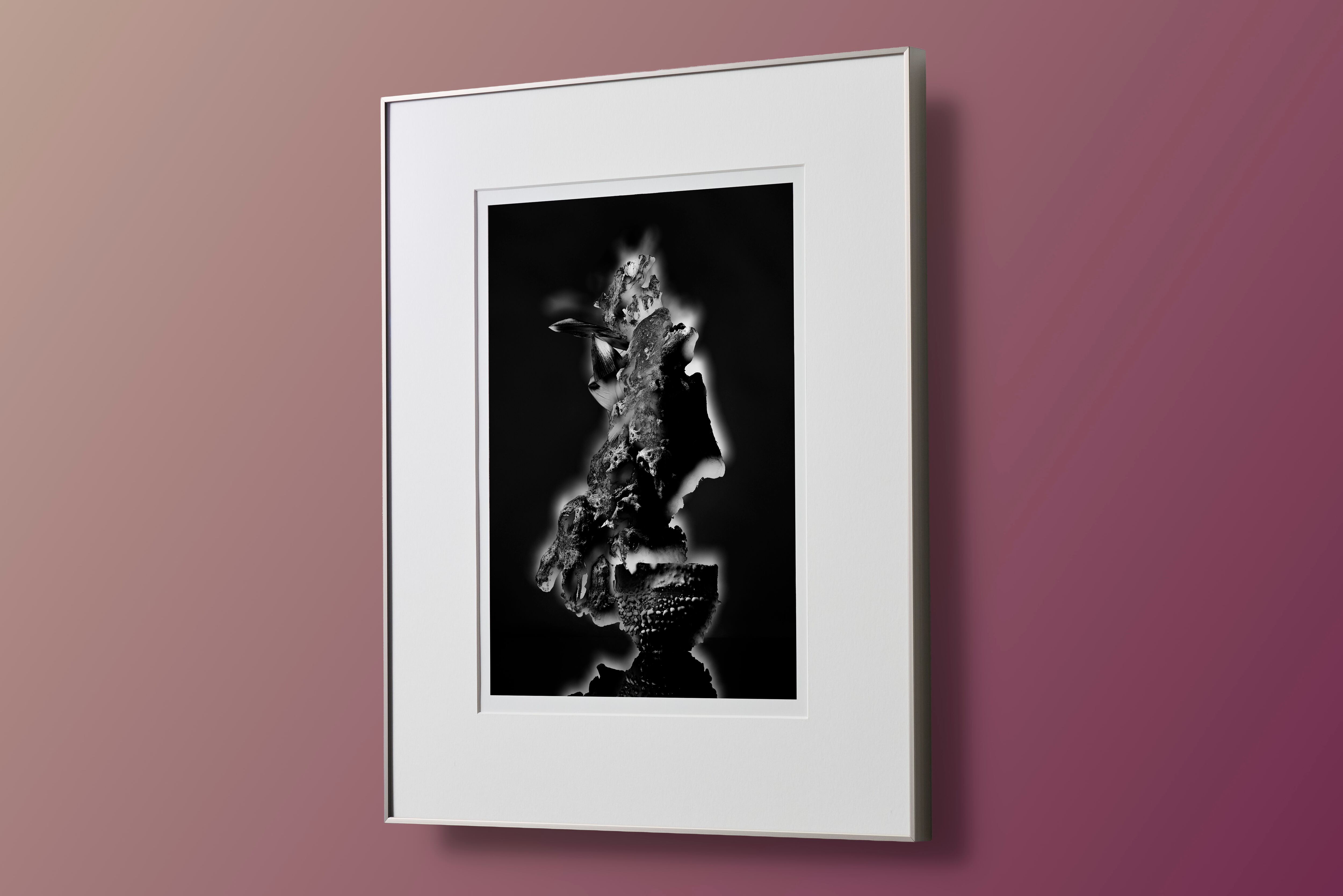 それぞれの生命の形が重なり合い、全体として大胆なバランスを生み出し、木の表皮や小さな花弁が細部に豊かな魅力を宿します。